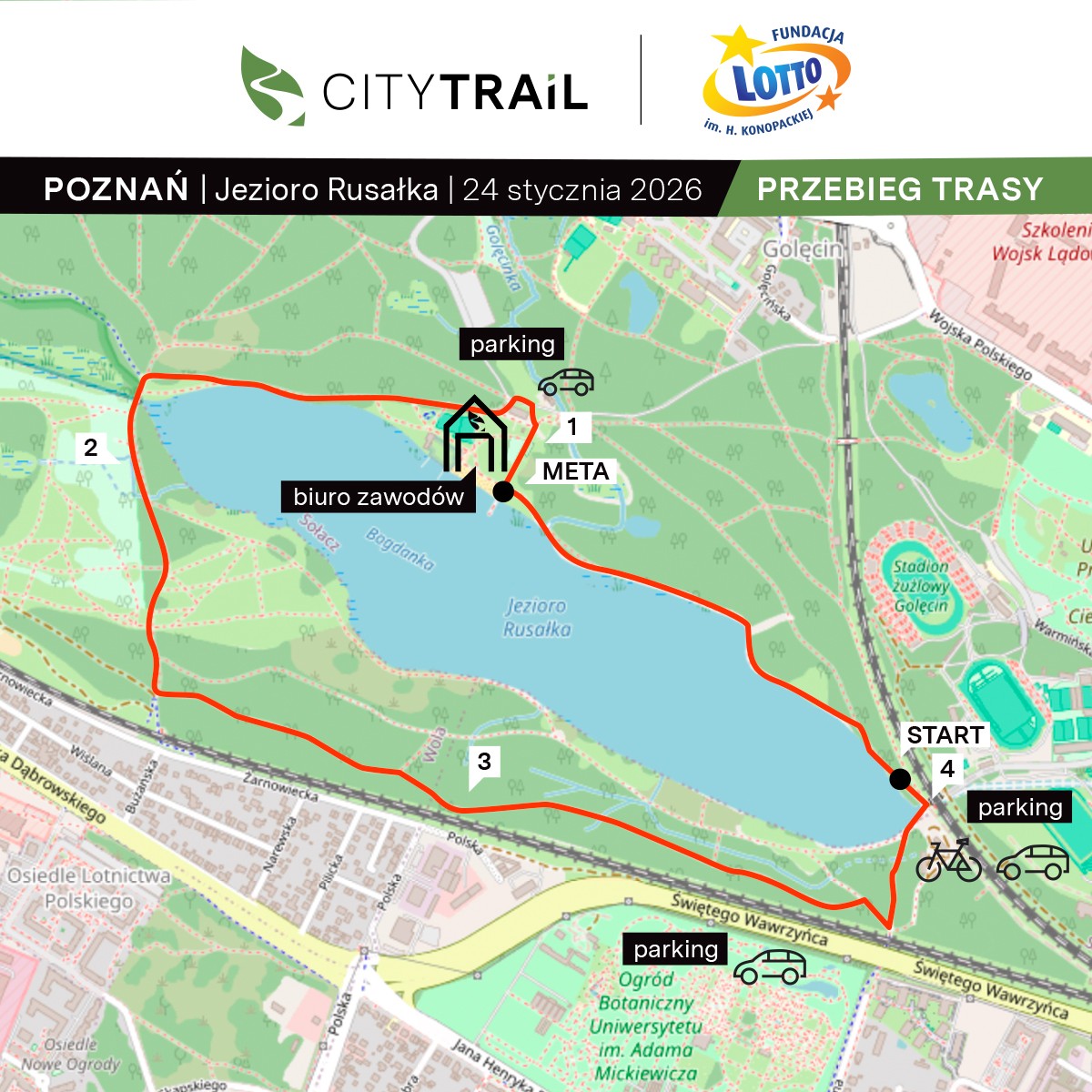 Tegoroczna zima daje nam się we znaki. Leśne ścieżki wielu miast są oblodzone, co stanowi dla Was - Biegaczy(-ek) codzienne wyzwanie, ale jest problematyczne także dla nas - organizatorów przełajowych zawodów. Po dwóch dniach analizowania warunków panujących nad poznańską Rusałką, podjęliśmy decyzję o przeprowadzeniu styczniowego biegu na zmodyfikowanej trasie.
