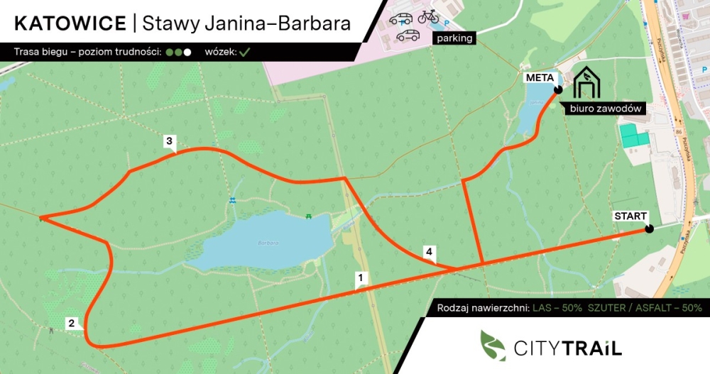 Trasy biegów CITY TRAIL to zawsze 5 kilometrów w pięknej, leśnej scenerii. Właśnie dlatego nasze zawody są dla każdego - dla początkujących, ponieważ dystans 5 kilometrów można przebyć marszobiegiem bez większego wysiłku, dla tych bardziej zaawansowanych - aby mogli sprawdzić się zawsze na tej samej trasie - nie tylko w perspektywie miesięcy, ale nawet lat. W Katowicach biegamy na terenie Lasów Państwowych Nadleśnictwa Katowice.
